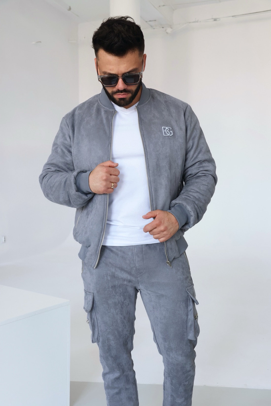 Kurtka zamszowa BG DAMON. Zapinana na srebrny suwak. Dodatkowo na przodzie dwie kieszenie również zapinane na suwaki. Na sercu logowane logiem BG w tonacji materiału. Kurtka wykończona ściągaczem. Kurtka lekko ocieplana, na podszewce.