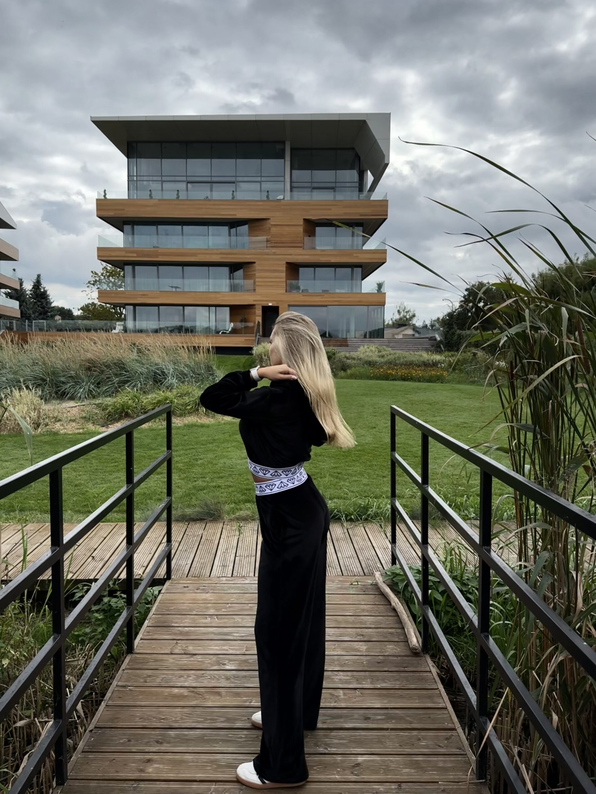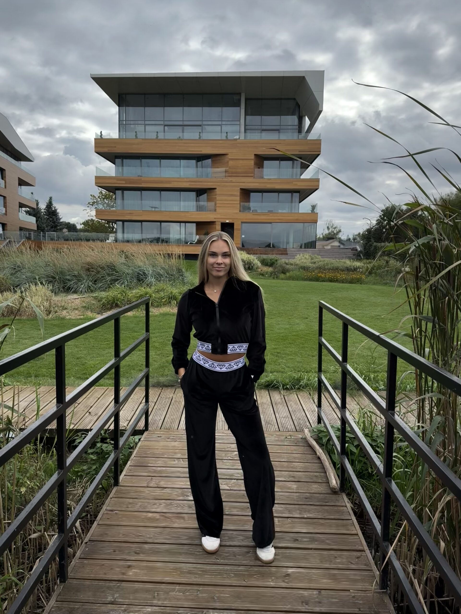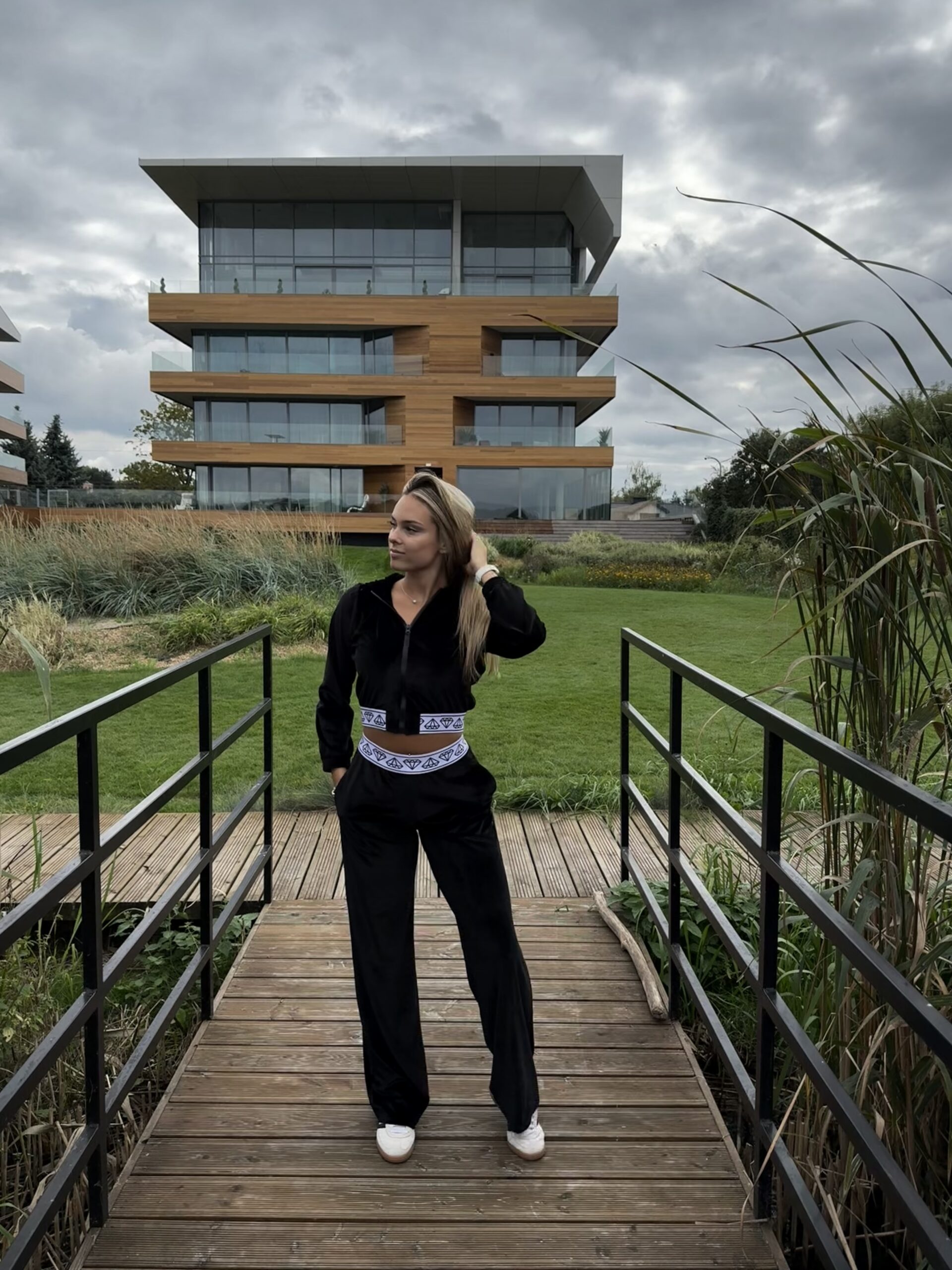 Dwuczęściowy komplet wykonany z bardzo miłego w dotyku weluru ice z poświatą w czarnym kolorze. Bluza ma o krótszy krój, zakończona na dole elastyczną gumą w białym kolorze logowana czarnymi diamentami. Zapinana z przodu na suwak w kolorze tkaniny. Ten sam element logowanej gumy znajduje się także w talii w spodniach. Dolny element zestawu z wysokim stanem ma nieco luźniejszy krój z rozszerzanymi nogawkami ku dołowi.